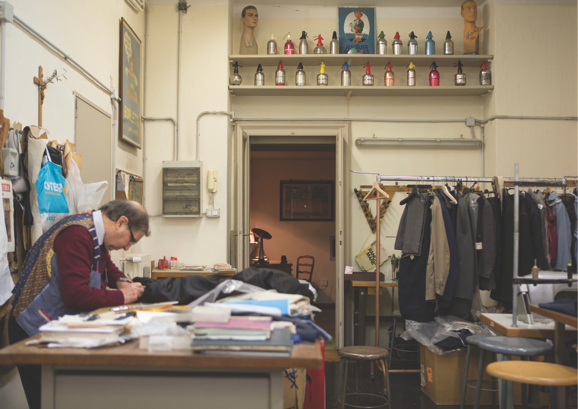 Since 1954, fully handmade bespoke suits and jackets have been crafted using fabrics sourced from vintage archives, prepared with customized finishes.